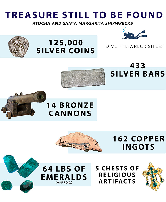 Mel Fisher’s Expeditions continues the search for one of the largest remaining treasure caches in the world. The Atocha and Santa Margarita shipwrecks, lost in the 1622 hurricane off Key West, still hold an enormous amount of unrecovered wealth. Decades of research and modern technology tell us that a significant portion of their treasure remains on the ocean floor, waiting to be found.