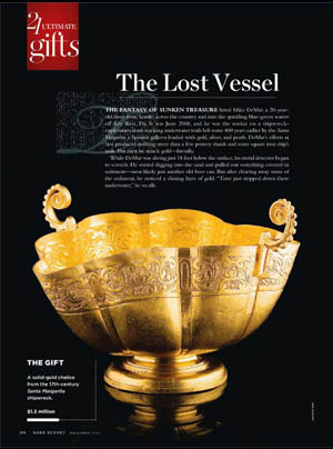 December, 2010 (Carol Tedesco, Blue Water Ventures) -- The Robb Report, the definitive luxury lifestyle publication for those who really do have everything, has hit the holiday newsstands with its annual offering of the 21 Ultimate Gifts in the entire world. This year, featured among indulgences that include a $44 million super-yacht and expedition, $20 million backyard home theme park, $9.78 million Bugatti sports car package, $2.5 million fighter jet training and combat battle experience, $1.75 million lion-saving expedition with National Geographic explorers—and other selections of almost unimaginable opulence, luxury and adventure—is the magnificent gold chalice discovered by Mel Fisher’s Treasures’ joint venture partners; Keith Webb’s Blue Water Ventures on the Santa Margarita shipwreck expedition.