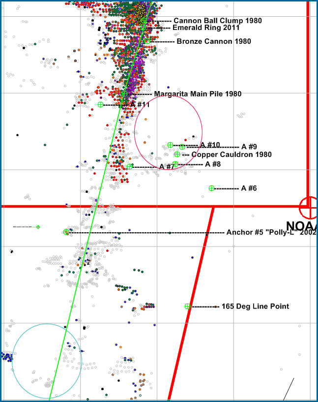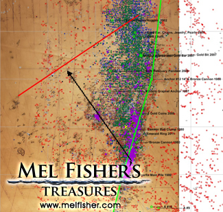 The good news is while executing our 24/7 off-shore operation we covered more ground than we have ever done in the past. This season we covered approximately a 27nm tall x 6.5nm wide area with our digital side scan sonar system and magnetometer extending our search area further to the north (shown below as the green box). After much discussion amongst our team, we decided to go north thinking the strong Gulf Stream currents may have moved our wreck further in this direction before settling on the bottom. Unfortunately, we didn't see the preverbal "smoking gun" target that would make us say "that's it, we found the wreck".