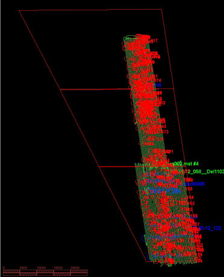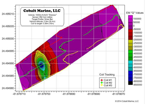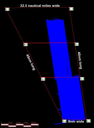 Gary Randolph compiled several calculations regarding the survey work on the Lost Merchant search area. So far this year we have side scanned and magged (the side scan nadir or blind spot) 141.5 square nautical miles (nm) of sea floor. It is an area 5.3 nm wide by 26.7 nm long.