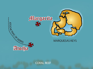 On their most recent trip to the Atocha site the crew of the JB Magruder along with a group of adventurers uncovered a silver coin, musket ball , gunners dice, encrusted objects, a large barrel hoop fragment, two iron spikes and pottery. The crew is currently re-provisioning and will head back out to the site tomorrow and they will continue to search in the area we call the 'Mystery Pile' due to the large size of some of the ballast stones found in this area. The weather looks beautiful this week so be sure to give us a call if you would like to dive for treasure with us! They are on the hunt for over 120,000 silver coins, 14 tons of silver, 150 copper ingots, over 100 gold bars and discs and 12 bronze cannons on the Atocha and Margarita sites. Remember, the totals of manifested treasure yet to be found is estimated to reach over $260 million dollars. This does not include the value of smuggled goods which was commonplace in the 1600s. The King was taking 90% forced loans to fund his military endeavors so folks had very good reason to avoid documenting their shipments.