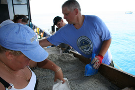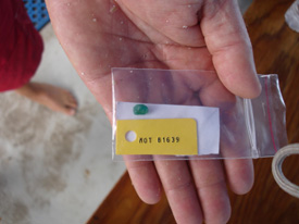 This week we have found 21 emeralds, and we’re still counting. Investors love the thrill of the hunt for these beautiful gems. A system is put in place where one Mel Fisher’s crewmember heads to the bottom where he utilizes an airlift to excavate a carefully gridded area. The material (including water, sand and hopefully emeralds) is transported via hose to the surface where it is sent through a series of increasingly smaller grates that separate the larger materials from the smaller; it then sends the water back overboard. At this point investors and crewmembers working these grates, known as “sluice boxes”, sift through the sediment searching for the green gems. At first it seems like a daunting task, that one would never be able to pick out such a small piece amongst all of the material. However, when one does come across an emerald it is unmistakable and impossible to miss. No matter how many times it is explained this is something most don’t fully understand until it happens to them. Then a big smile and an understanding nod come along with their first emerald find.
