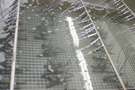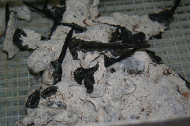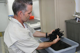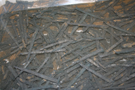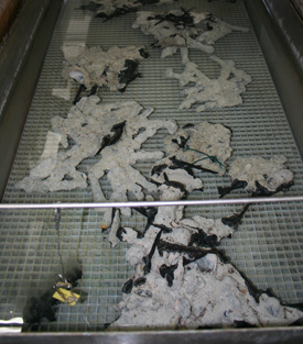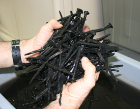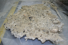 The crew of the Magruder found a very large clump of spikes on the Atocha trail which Senior Conservator John Corcoran has begun to work on. The large slab of encrusted spikes had to be carefully separated into more managable sections in order to fit into the wet storage tanks. Corcoran has so far separated 380 individual spikes from the main clump. An official count of the total number of artifacts will not be available until all of the spikes have all been conserved but based on what he has done so far Corcoran estimates there will be somewhere in the neighborhood of 1,000 spikes. Look how large the original conglomeration was!